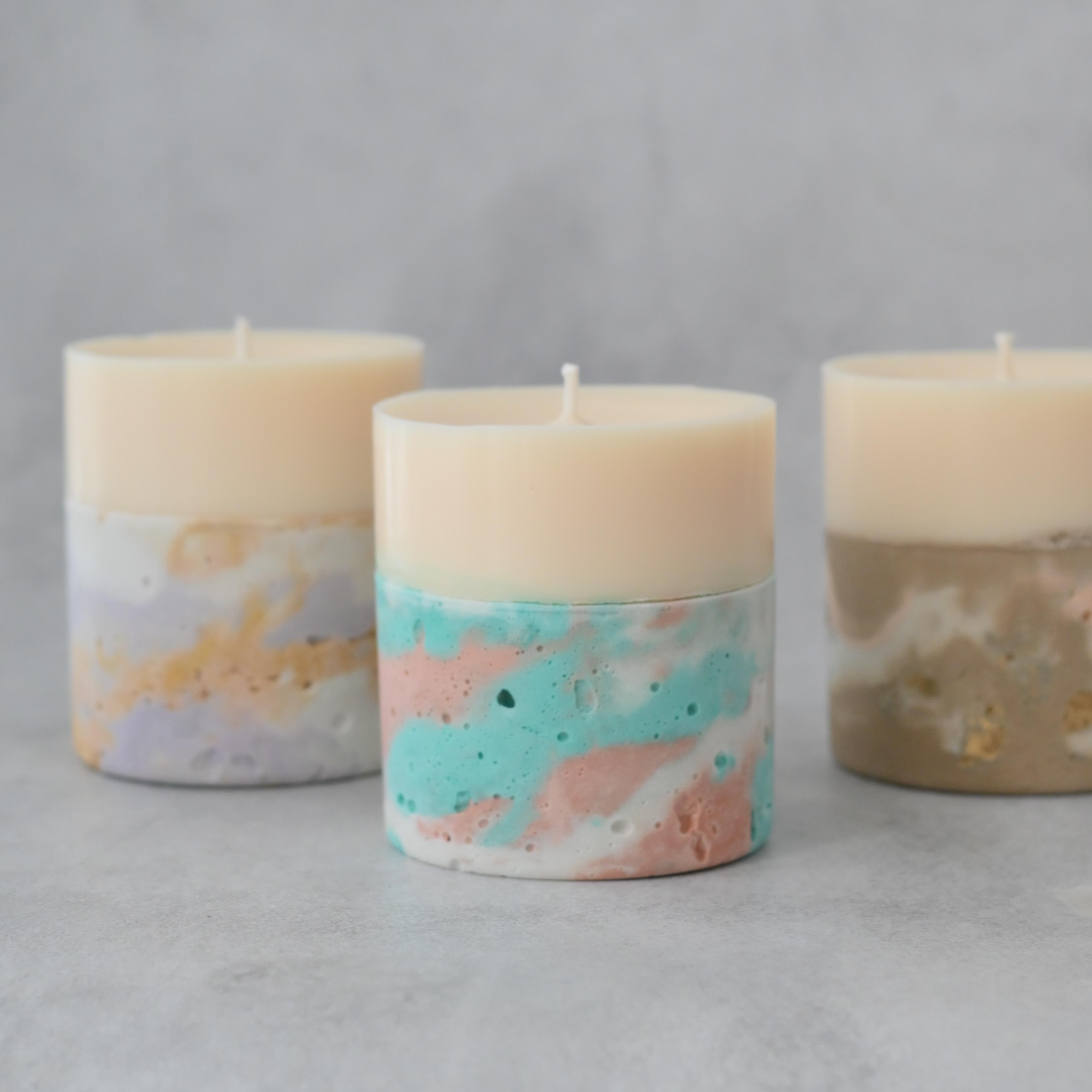 土台をマーブル模様のセメントで制作した、存在感が際立つキャンドルを制作します。