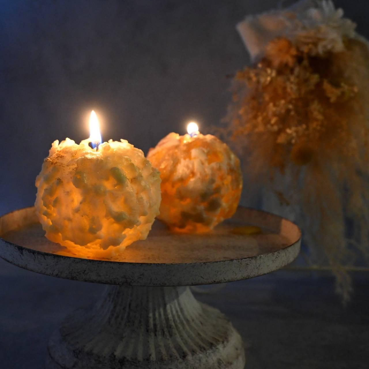キャンドルの質感について、キャンドルの表面に気泡(バブル)を入れる技法、キャンドル表面をマット(光沢がない)な質感やクレーター(凸凹)のような質感にする技法を学びます。